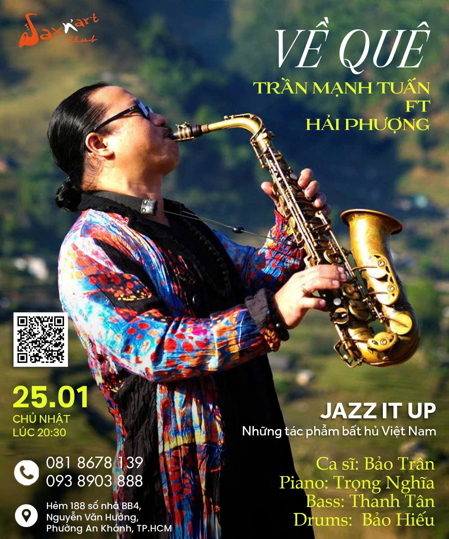 Đêm nhạc Về Quê sẽ được dẫn dắt bởi Maestro Trần Mạnh Tuấn, cùng sự xuất hiện đặc biệt của nghệ sĩ đàn tranh Hải Phượng. Tiếng đàn tranh mảnh, trong, giàu chất Á Đông khi hòa cùng saxophone sẽ tạo nên một không gian rất riêng, vừa quen thuộc, vừa mới mẻ. Bảo Trân với sở trường Jazz sẽ mang đến những giai điệu blue, swing, funk qua các ca khúc nhạc Jazz kinh điển. Tất cả màu sắc ấy tạo nên 1 đêm nhạc "Fusion Night" thật phong phú và đặc sắc.