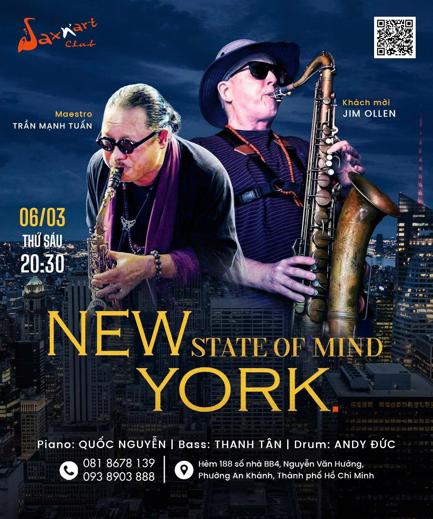 Trong không gian ấm và sâu của SaxN’Art Club, đêm nhạc là nơi jazz cất lên đúng tinh thần ấy. Tiếng saxophone dẫn lối, piano mở rộng không gian, bass và drum giữ nhịp chuyển động bền bỉ. Đặc biệt, sự góp mặt của Jim Ollen từ New York mang đến sắc thái nguyên bản, nơi mỗi câu nhạc đều mang theo hơi thở của thành phố không ngủ.