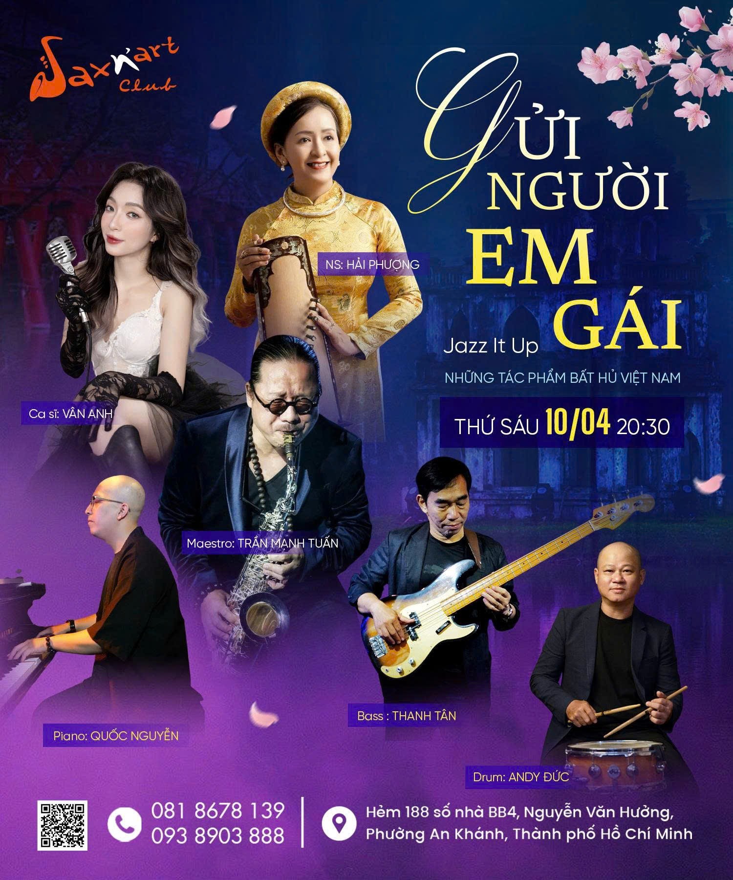 Và trong không gian đầy hoài niệm ấy, đêm nhạc sẽ được dẫn dắt bởi Maestro Trần Mạnh Tuấn, cùng sự góp mặt của nghệ sĩ Hải Phượng, giọng hát Vân Anh và bộ ba nhạc công Quốc Nguyễn (piano), Thanh Tân (bass), Andy Đức (drum). Một đêm đủ tinh tế để “Gửi người em gái” được kể lại bằng nhiều sắc thái mới, sâu lắng và đầy hoài niệm.