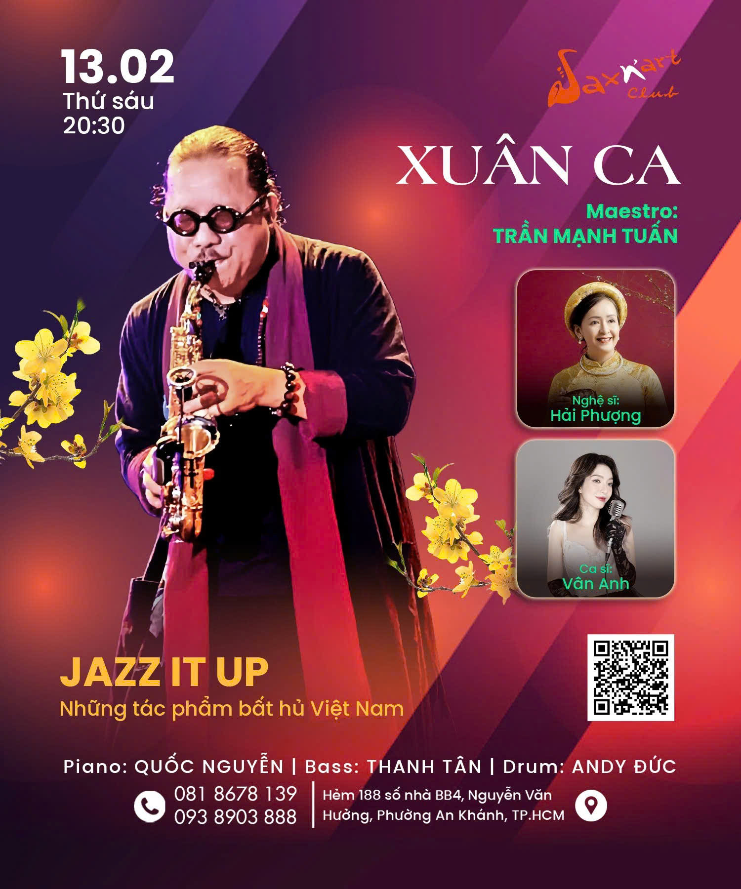 🎶 𝐗𝐔𝐀̂𝐍 𝐂𝐀 | 𝐒𝐚𝐱𝐍’𝐀𝐫𝐭 𝐂𝐥𝐮𝐛 📅 𝐓𝐡𝐮̛́ 𝐒𝐚́𝐮 𝟏𝟑/𝟎𝟐 | 𝐒𝐡𝐨𝐰𝐭𝐢𝐦𝐞: 𝟗:𝟎𝟎 𝐏𝐌 – 𝟏𝟏:𝟎𝟎 𝐏𝐌